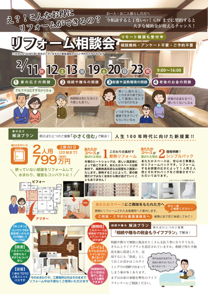 - 2月11日(祝金)・12日(土)・13日(日)・19日(土)・20日(日)・23日(祝水)※開催日時以外にもお客様のご都合に応じて対応させていただきます。