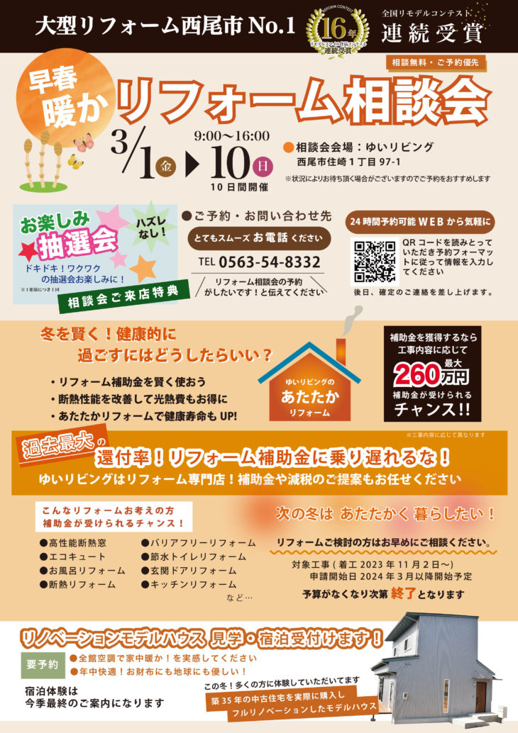 会場 ゆいリビング住崎ショールーム 会場住所 西尾市住崎1丁目97-1 開催日時 3月1日(金)〜10日(日) 参加費 無料 一言 相談無料・ご予約優先 備考 ※状況によりお待ちいただく場合がございます。下記の予約フォーマットからのご予約をおすすめします アクセスマップを確認する