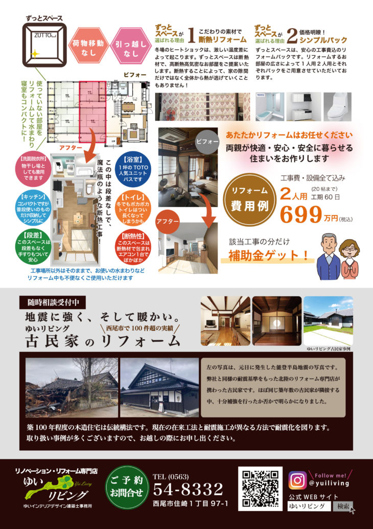 HOMEイベント・チラシ・メディア情報イベント早春あたたかリフォーム相談会 早春あたたかリフォーム相談会(終了しました) 開催日時 3月1日(金)〜10日(日)(会場:ゆいリビング住崎ショールーム) 詳しくはこちら > 会場 ゆいリビング住崎ショールーム 会場住所 西尾市住崎1丁目97-1 開催日時 3月1日(金)〜10日(日) 参加費 無料 一言 相談無料・ご予約優先 備考 ※状況によりお待ちいただく場合がございます。下記の予約フォーマットからのご予約をおすすめします アクセスマップを確認する イベント・チラシ・メディア情報一覧はこちら ゆい・リビングについて 選ばれる10の理由 会社満足のために 会社案内 感動力の充実 社員満足のために 社員紹介 リクルート情報 協力業者満足のために 協力業者「結の会」とは 顧客満足度向上プロジェクト 顧客満足のために お客様の声 一覧 お客様紹介~お客様の声~ コンセプト atataka あたたかプラス あたたかスペース あたたかハーフ 古民家 古民家スペース 古民家ハーフ 古民家プラス ZUTTO ZUTTOプラス ZUTTOスペース ZUTTOハーフ きらり きらりプラス きらりスペース きらりペイント 店舗リフォーム 施工事例 施工事例一覧 ALL 性能向上リノベ住宅 ZUTTO リノベプロデュースハウス atataka 古民家再生リノベ お化粧リフォーム き・ら・り 店舗リフォーム エクステリア コンテスト受賞リノベ オリジナル イベント・チラシ・メディア情報 情報一覧 モデルハウス イベント チラシ メディア ゆい・リビングコラム ゆい・リビングの現場日記 スタッフブログ 代表者コラム 代表者コラム一覧 その他 その他 代表者コラム お家のこと リフォーム事例 大切な金の話 お役立ち情報 リノベーションの流れ 20のチェックポイント お問い合わせ お問い合わせ © 2019 株式会社ゆい・リビング