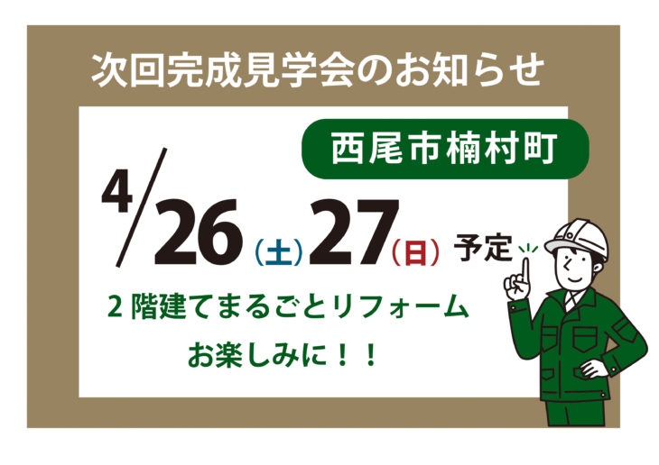 HOMEイベント・チラシ・メディア情報イベント4月12日・13日完成見学会 4月12日・13日完成見学会(終了しました) お電話もしくはお問い合わせフォームにてご予約ください。●お問い合わせ内容欄に「完成見学会の予約」とご記載ください。●お問い合わせ内容欄にご希望の日にち、時間をご記載ください。(希望日時をいくつかご提示いただけるとスムーズです。) お電話もしくはお問い合わせフォームにてご予約ください。●お問い合わせ内容欄に「完成見学会の予約」とご記載ください。●お問い合わせ内容欄にご希望の日にち、時間をご記載ください。(希望日時をいくつかご提示いただけるとスムーズです。) ゆい・リビングについて 選ばれる10の理由 会社満足のために 会社案内 感動力の充実 社員満足のために 社員紹介 リクルート情報 協力業者満足のために 協力業者「結の会」とは 顧客満足度向上プロジェクト 顧客満足のために お客様の声 一覧 お客様紹介~お客様の声~ コンセプト atataka あたたかプラス あたたかスペース あたたかハーフ 古民家 古民家スペース 古民家ハーフ 古民家プラス ZUTTO ZUTTOプラス ZUTTOスペース ZUTTOハーフ きらり きらりプラス きらりスペース きらりペイント 店舗リフォーム 施工事例 施工事例一覧 ALL 性能向上リノベ住宅 ZUTTO リノベプロデュースハウス atataka 古民家再生リノベ お化粧リフォーム き・ら・り 店舗リフォーム エクステリア コンテスト受賞リノベ オリジナル イベント・チラシ・メディア情報 情報一覧 モデルハウス イベント チラシ メディア ゆい・リビングコラム ゆい・リビングの現場日記 スタッフブログ 代表者コラム 代表者コラム一覧 その他 その他 代表者コラム お家のこと リフォーム事例 大切な金の話 お役立ち情報 リノベーションの流れ 20のチェックポイント お問い合わせ お問い合わせ © 2019 株式会社ゆい・リビング