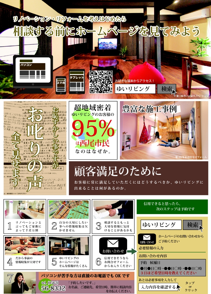 HOMEイベント・チラシ・メディア情報チラシリノベーション・リフォームを考えはじめたら リノベーション・リフォームを考えはじめたら ゆいリビングが選ばれる⑩の理由 その一 住宅リフォームの専門店であることその二 西尾にショールームがあることその三 お客様の再度依頼率は87%超その四 工事に関わる人の95%が西尾市民その五 日曜営業その六 面倒な補助金代行制度があることその七 現場調査の充実。最大12のチェック項目その八 お客様の93%が西尾市という超地域密着店その九 信頼を頂くために皆で定期勉強会を開催中その十 お客様満足度を競う全国コンテスト12年連続受賞 お申し込みはこちらから 必須お名前 例: 山田 太郎 必須電話番号 例: 0563-00-0000 必須イベント名 例: 完成見学会 任意参加希望日 第一希望日 第二希望日 第三希望日 ※【定休日】水曜日・GW・盆・正月 例: 1/1 10:00-12:00 必須参加人数 お子様同伴 例:2名 必須メールアドレス 例: t_yamada@sample.jp 必須郵便番号 住所検索 例: 123-4567 必須住所 例:愛知県西尾市**** 任意お問い合わせ内容 ※お急ぎの方は、 直接 0563-54-8332(9:00~17:00)まで、お電話ください。 例:※Telにて日時を決めたい場合や、 「何曜日が希望」等は、こちらに入力してください。 ※相談内容は個人情報保護法に適用いたします。 24時間以内に回答を心がけておりますが、相談内容等によって、 2〜3日かかる事もございますので、何卒御了承ください。 お電話でもお気軽にどうぞ! 内容をご確認の上、よろしければ下記の「入力内容を確認する」ボタンを押してください。 個人情報の取り扱いについて 個人情報利用目的 ・お客様のご要望に合わせたサービスを提供させていただくための各種ご連絡。 ・お問い合わせいただいたご質問への回答のご連絡。 尚、お客様から収集する個人情報は弊社の定めるプライバシーポリシーに則って厳重に管理いたします。 プライバシーポリシー 弊社では、利用者のみなさんの個人情報がきちんと守られることを、何よりも大切にしています。また、利用者ご本人への事前の許可なしに第三者に個人情報を配送作業以外に開示することは絶対にいたしません。 どんな些細な事でも結構です。ご相談、お見積もりなど、お気軽にご連絡下さい。上記メールフォームからご連絡いただくか、電話にてご連絡ください。 必須マークがついている項目は必ずご記載下さい。(株)、(有)や丸囲み数字等の機種依存文字は、文字化けの原因となりますので、使用しないようお願いいたします。 イベント・チラシ・メディア情報一覧はこちら ゆい・リビングについて 選ばれる10の理由 会社満足のために 会社案内 感動力の充実 社員満足のために 社員紹介 リクルート情報 協力業者満足のために 協力業者「結の会」とは 顧客満足度向上プロジェクト 顧客満足のために お客様の声 一覧 お客様紹介~お客様の声~ コンセプト atataka あたたかプラス あたたかスペース あたたかハーフ 古民家 古民家スペース 古民家ハーフ 古民家プラス ZUTTO ZUTTOプラス ZUTTOスペース ZUTTOハーフ きらり きらりプラス きらりスペース きらりペイント 店舗リフォーム 施工事例 施工事例一覧 ALL 性能向上リノベ住宅 ZUTTO リノベプロデュースハウス atataka 古民家再生リノベ お化粧リフォーム き・ら・り 店舗リフォーム エクステリア コンテスト受賞リノベ オリジナル イベント・チラシ・メディア情報 情報一覧 モデルハウス イベント チラシ メディア ゆい・リビングコラム ゆい・リビングの現場日記 スタッフブログ 代表者コラム 代表者コラム一覧 その他 その他 代表者コラム お家のこと リフォーム事例 大切な金の話 お役立ち情報 リノベーションの流れ 20のチェックポイント お問い合わせ お問い合わせ © 2019 株式会社ゆい・リビング
