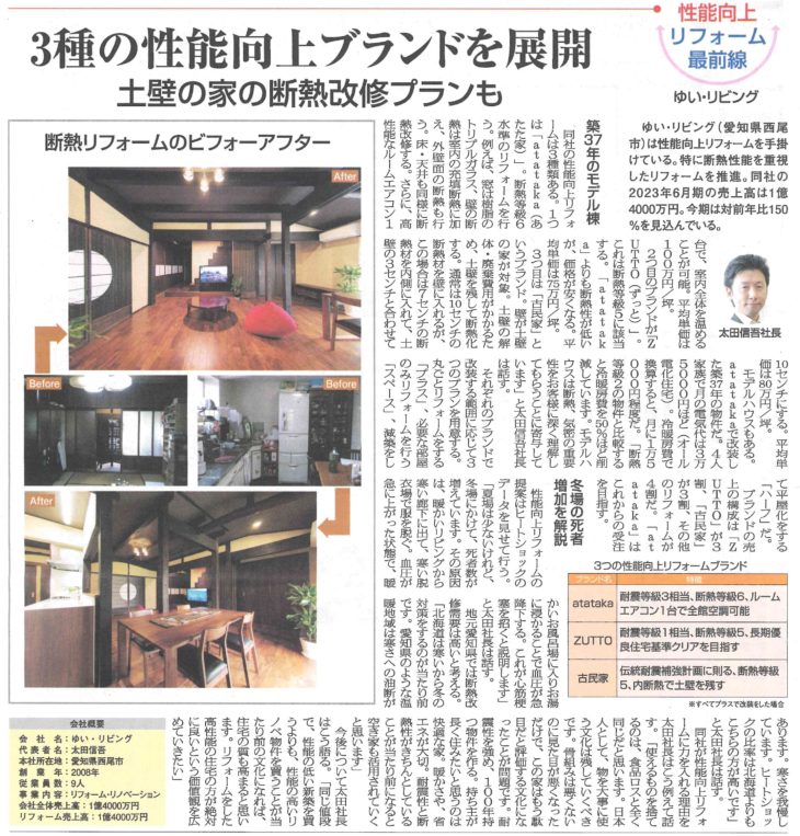 HOMEイベント・チラシ・メディア情報メディアリフォーム産業新聞掲載 リフォーム産業新聞掲載 イベント・チラシ・メディア情報一覧はこちら ゆい・リビングについて 選ばれる10の理由 会社満足のために 会社案内 感動力の充実 社員満足のために 社員紹介 リクルート情報 協力業者満足のために 協力業者「結の会」とは 顧客満足度向上プロジェクト 顧客満足のために お客様の声 一覧 お客様紹介~お客様の声~ コンセプト atataka あたたかプラス あたたかスペース あたたかハーフ 古民家 古民家スペース 古民家ハーフ 古民家プラス ZUTTO ZUTTOプラス ZUTTOスペース ZUTTOハーフ きらり きらりプラス きらりスペース きらりペイント 店舗リフォーム 施工事例 施工事例一覧 ALL 性能向上リノベ住宅 ZUTTO リノベプロデュースハウス atataka 古民家再生リノベ お化粧リフォーム き・ら・り 店舗リフォーム エクステリア コンテスト受賞リノベ オリジナル イベント・チラシ・メディア情報 情報一覧 モデルハウス イベント チラシ メディア ゆい・リビングコラム ゆい・リビングの現場日記 スタッフブログ 代表者コラム 代表者コラム一覧 その他 その他 代表者コラム お家のこと リフォーム事例 大切な金の話 お役立ち情報 リノベーションの流れ 20のチェックポイント お問い合わせ お問い合わせ © 2019 株式会社ゆい・リビング