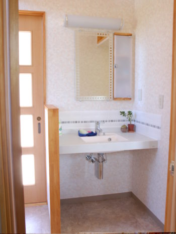 - ・洗面は奥様のこだわり。とてもオシャレなのですが、洗面下に収納スペースがない為、鏡の横にちょっとした収納棚を作り埋め込みました。入れる物の高さに合わせて調節出来るので見た目もスッキリ収納する事が出来ます。ここに入らない物は、収納部屋がすぐ近くにあるのでとても便利です。
