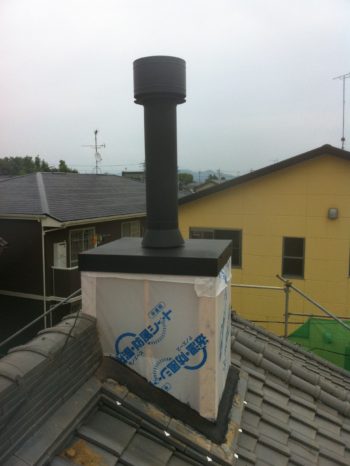 ・火種のもしもの落下も安心 「薪ストーブ周辺の ・躯体壁部にケイカル板+空気層+ケイカル板+タイル防火・耐火材料の選定」