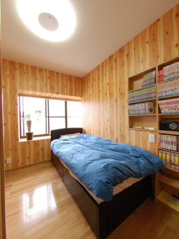 奥様は小学校の先生。兄妹の机が同じ部屋でという発想を頂けたことで、今回の間取りを提案する事ができました。 長女次女がまだ小さいので一緒に寝ていますが、成長しても部屋の真ん中で壁をつくることができるようにしています。 予算を削減するために、K様から本棚を支給していただき、空間に無駄なく納まるようカットし、空間も予算も無駄の無いご提案ができました。 |