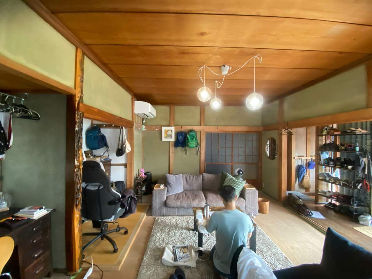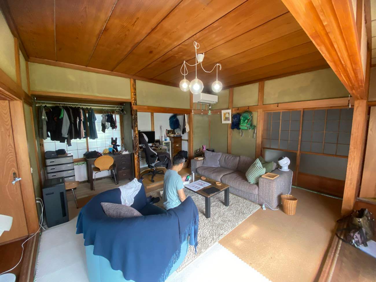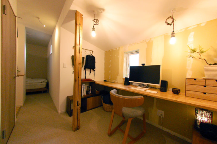 襖が取り払ってあり明るく、広々した印象の居間。押入れを活用したワーキング スペースが設置されていました。