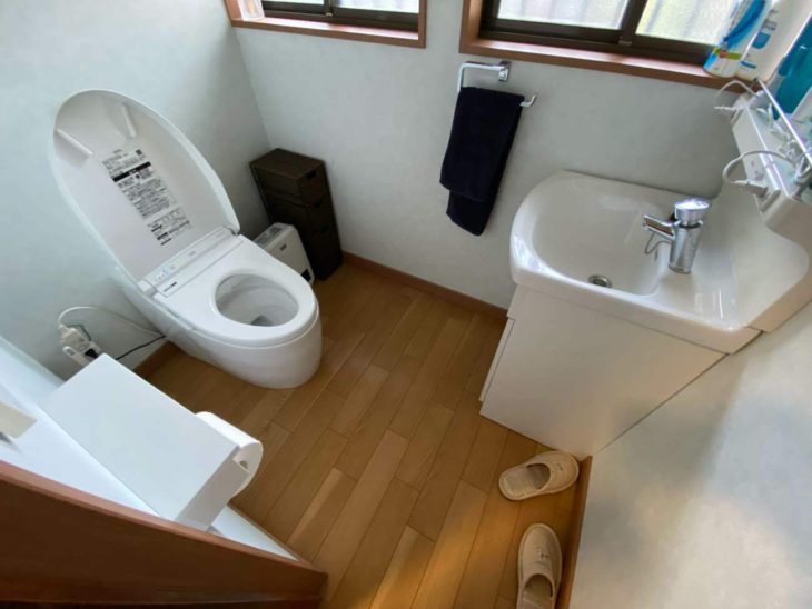 洗面とトイレは同じ空間にありました。トイレは少し前に交換したばかりで新しく綺麗でした。