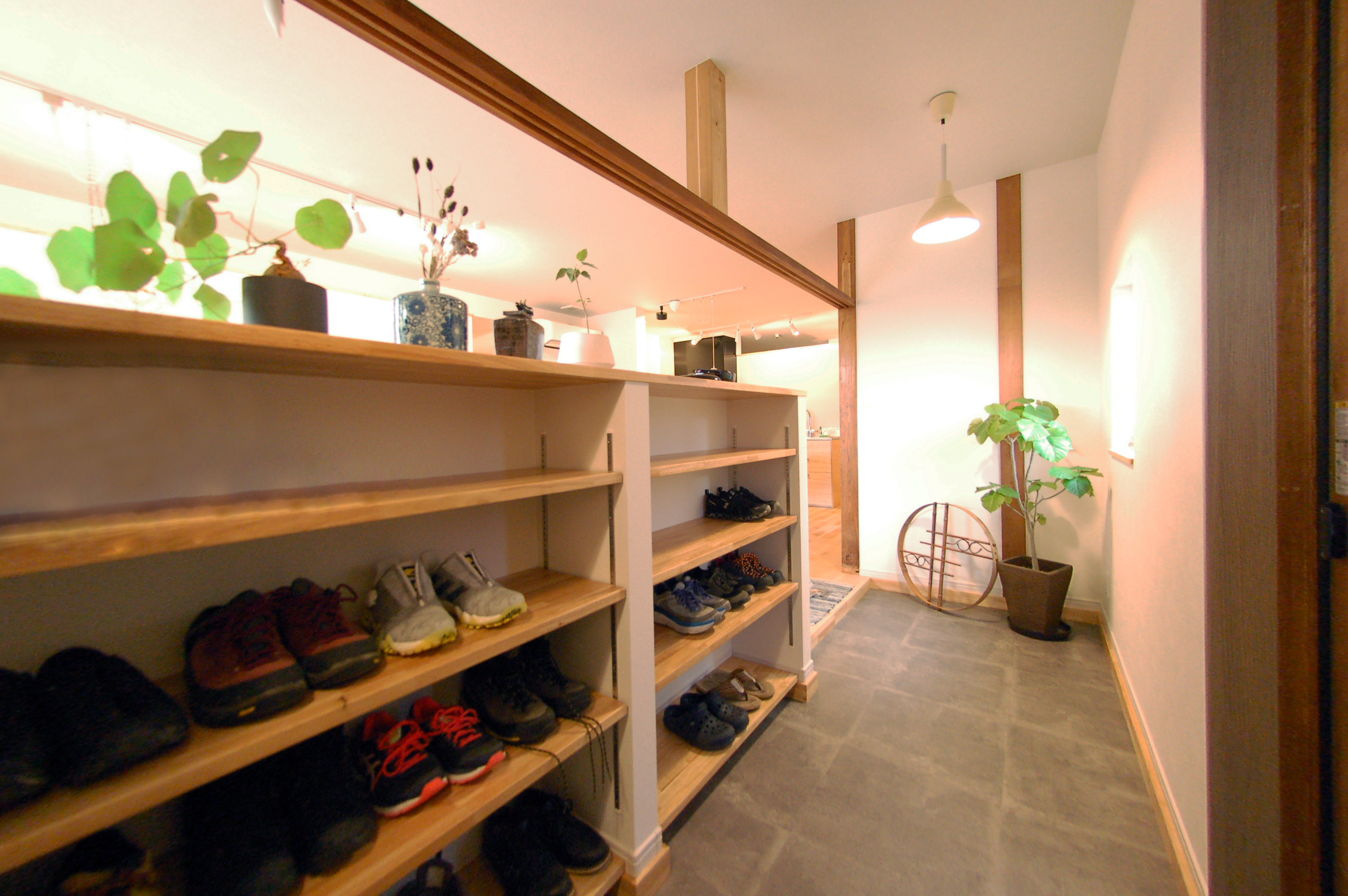 リビングとエントランスの仕切りにシュ ーズラックを造作。圧迫感を出さないために低い設計にし、その上には施主様好みの植物や花瓶も飾られています。