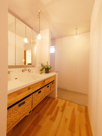 洗面は幅広のカウンターをチョイス。カウンタ ーの下にはぴったりサイズのバスケットが納まりすっきりとした見た目の空間となりました。