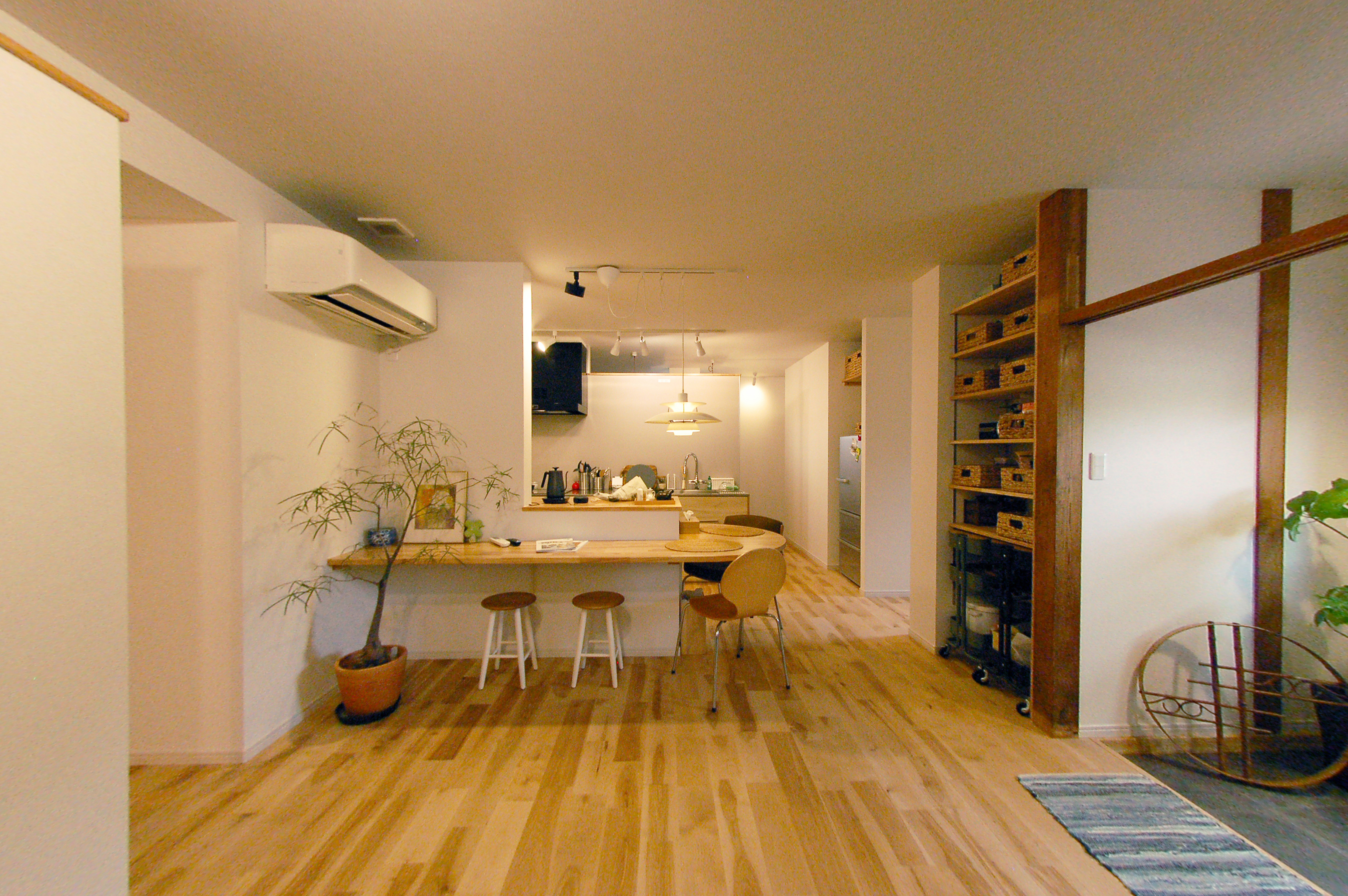 お一人の時も娘さんが来られた時も、機能的でいつも温かみのあるダイニングキッチン。料理がご趣味の施主様にとって大好きな空間になりました。 ワンルームにした事で無駄なスペースがなくなり、開放的なLDKになりました。