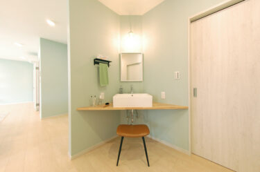 入浴中も気兼ねなく洗面所を使用できるよう、LDKの一角に洗面を設置。朝の身支度もスムーズになりました。夜はゆっくり座ってスキンケアタイム。