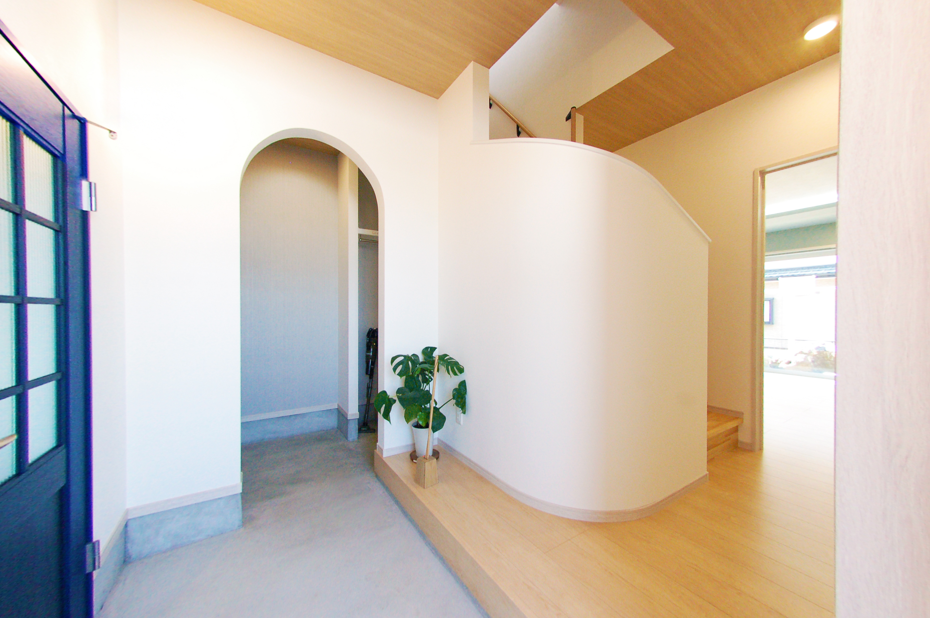 玄関ホールの階段壁をアールに設計。空間に柔らかさを。