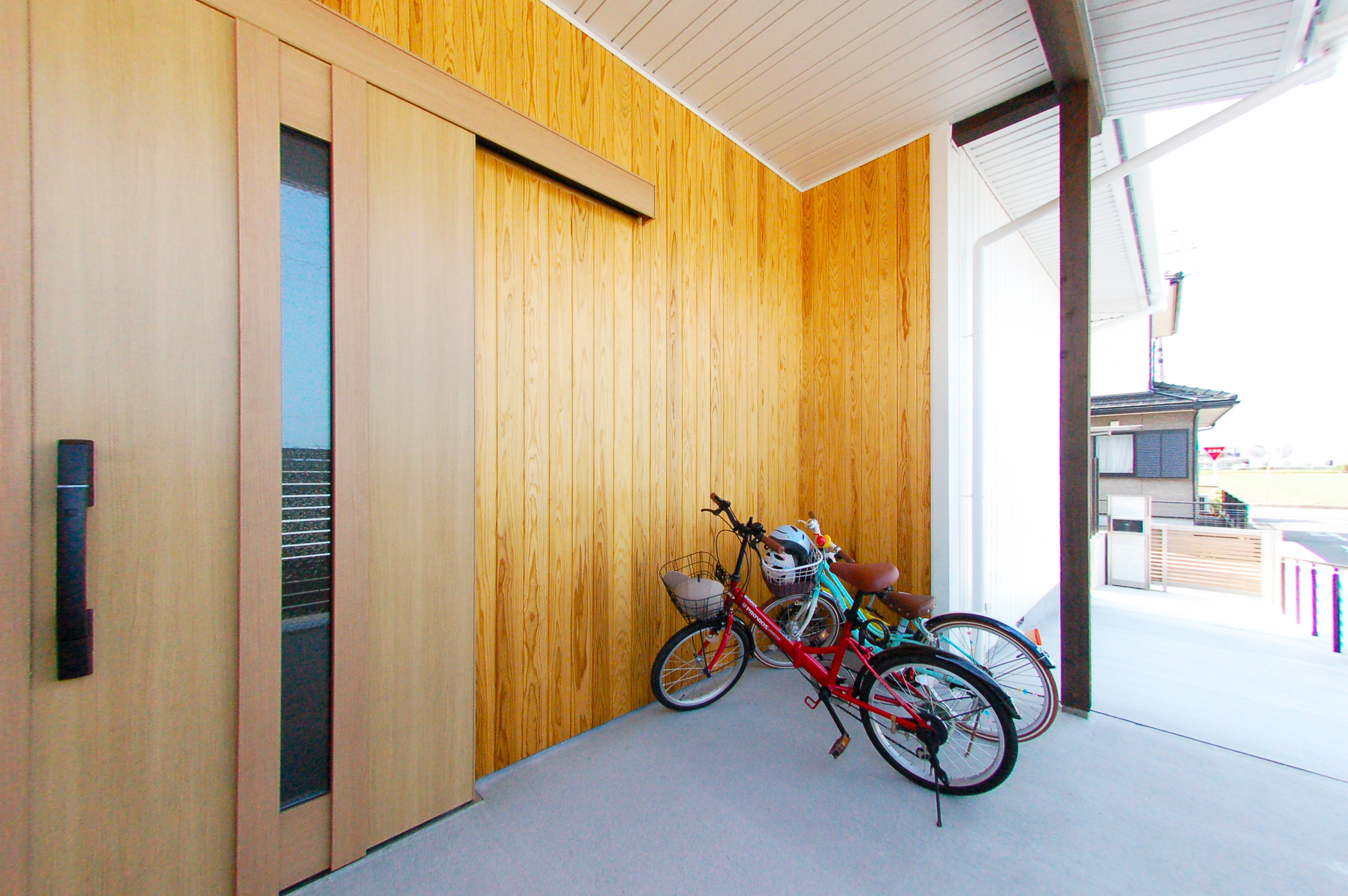 玄関とカーポートを繋ぐスロープを設計したことで安全性だけでなく防犯性もアップしました。お子様の自転車の乗り入れや将来車椅子になっても不便しません。