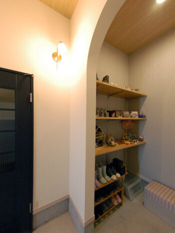 土間収納を通りリビングへいく動線を設けたことでご家族の靴が散らかりにくくすっきり保たれるようになりました。