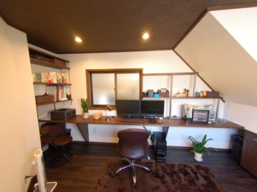 ・書斎は限られた広さでしたが、部屋の角や階段下のデッドスペースを利用した収納で空間を無駄にしてないところがいいですね。 主人が見当たらないときはだいたいこの部屋に居ます(笑)