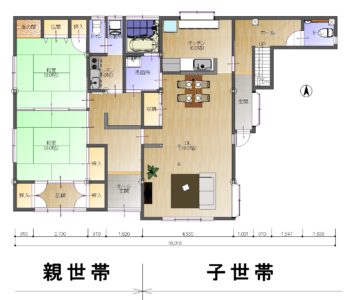 生活時間帯が異なるお母様と子世帯。一番気になるのは音ですが、家の中を完全に仕切ってしまう訳にはいきません。これらを間取りに落とし込むと、洗面所と浴室のみを共有部分にすることで住み分けることができます。