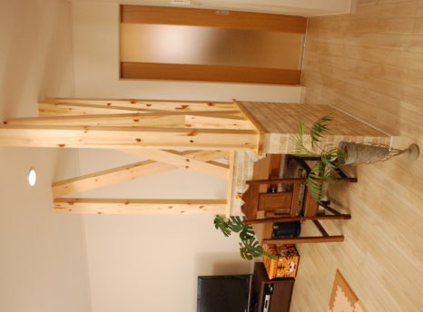北からしか光を取り入れることができない現状。南の客室との壁を取り除く事で問題は解決しますが、耐震性や2階の配置によるバランスを取るために、露出の筋交いを2箇所再配置。あこがれの広いLDKを実現します。