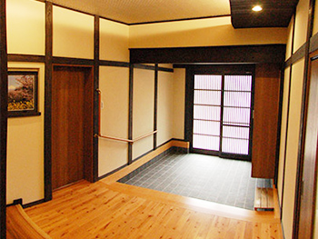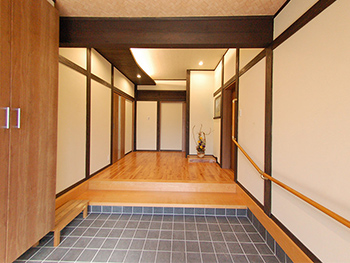 70代のお施主様の負担が軽減するよう手摺りをつけ、段差も緩やかにしました。