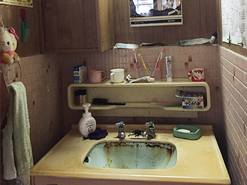 洗面台はライトを付けなければ薄暗く、風も通らない閉鎖された空間になっていました。