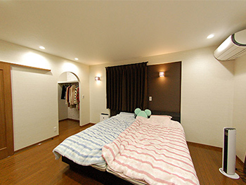 清潔感溢れる寝室は、クロスを一部分だけブラウンにし、空間にアクセントを持たせました。